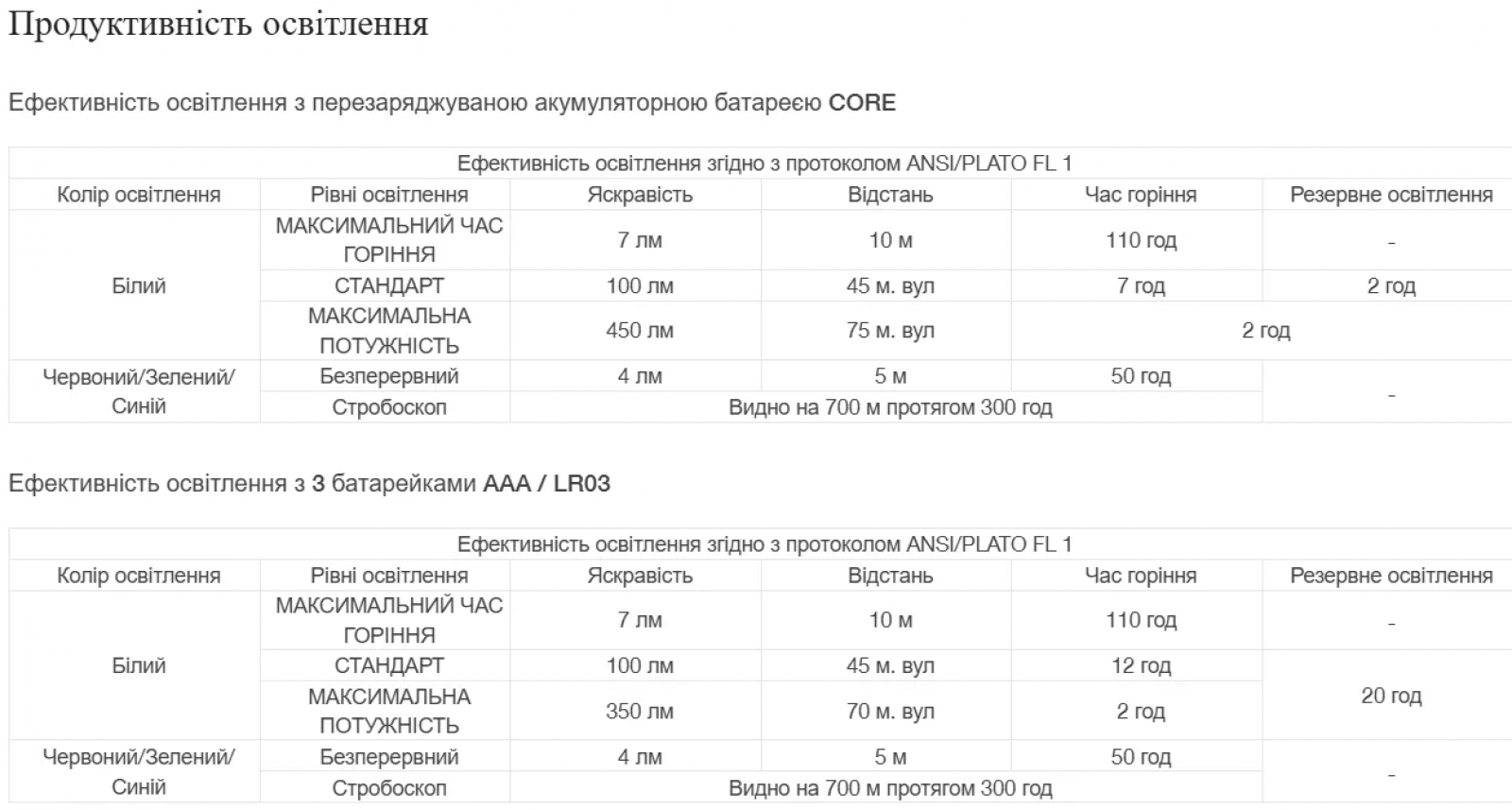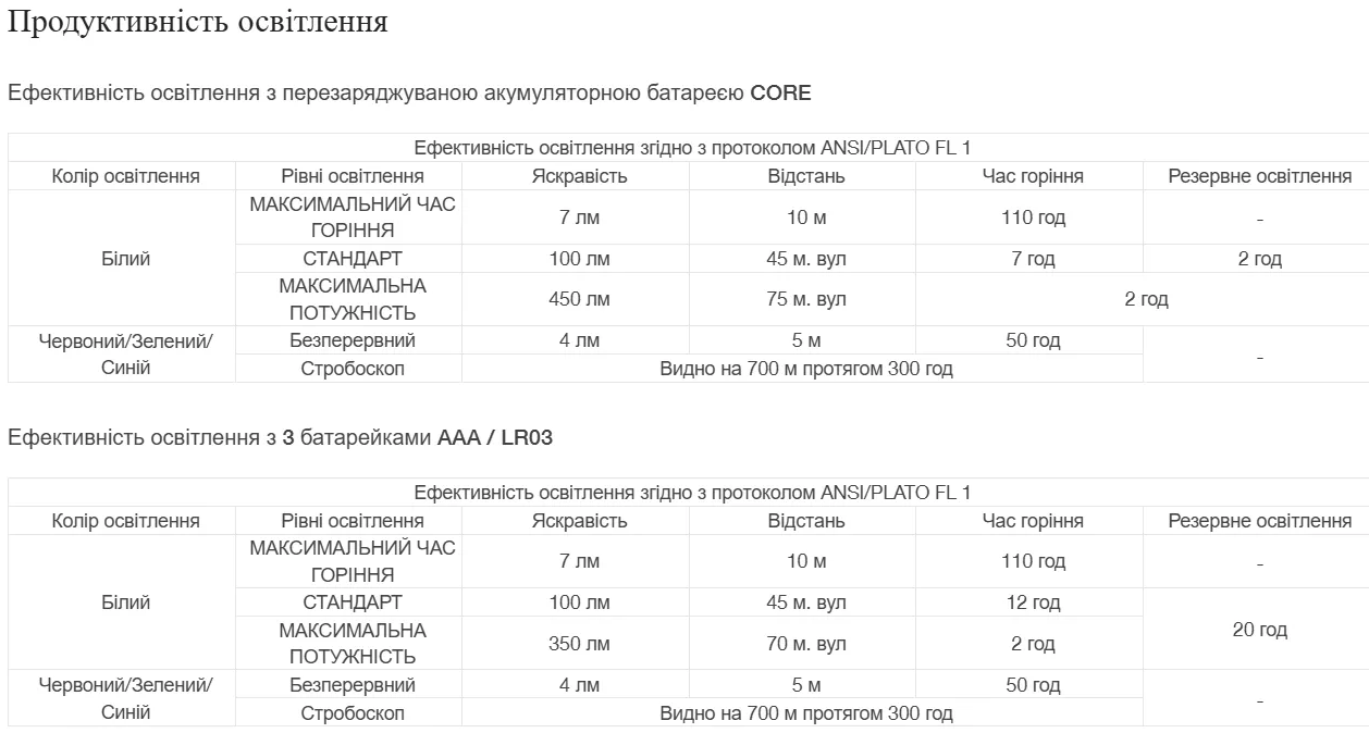 Корпус фонаря унифицирован, под исползование, по выбору, трех элементов питания ААА (в комплекте) или фирменного аккумулятора ACCU CORE8/А (в комплект не входит).
