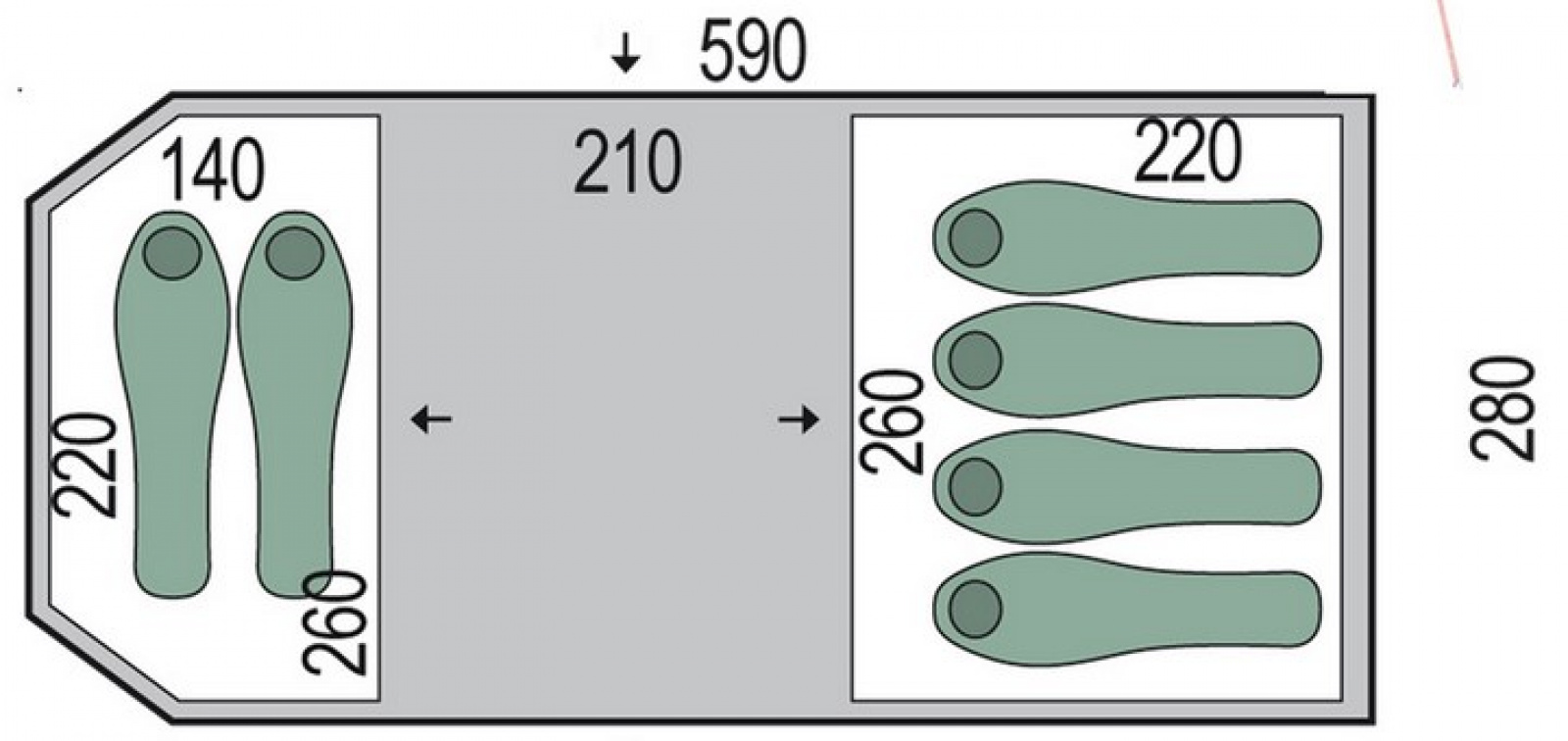 Комфортная шестиместная двухкомнатная кемпинговая палатка с большим тамбуром в рост человека. Идеально подходит для продолжительного отдыха всей семьей. В большом тамбуре легко размещается кухня или кемпинговая мебель, тамбур хорошо вентилируется, эластичные окна делают его достаточно светлым. Основное спальное отделение на 4 человека, второе, двухместное, спальное отделение можно не ставить и этим дополнительно увеличить площадь и без того немаленького холла палатки. Палатка легко устанавливается и может быть достаточно надежно растянута дополнительными штормовыми оттяжками, чтобы выдержать даже достаточно сильный ветер.