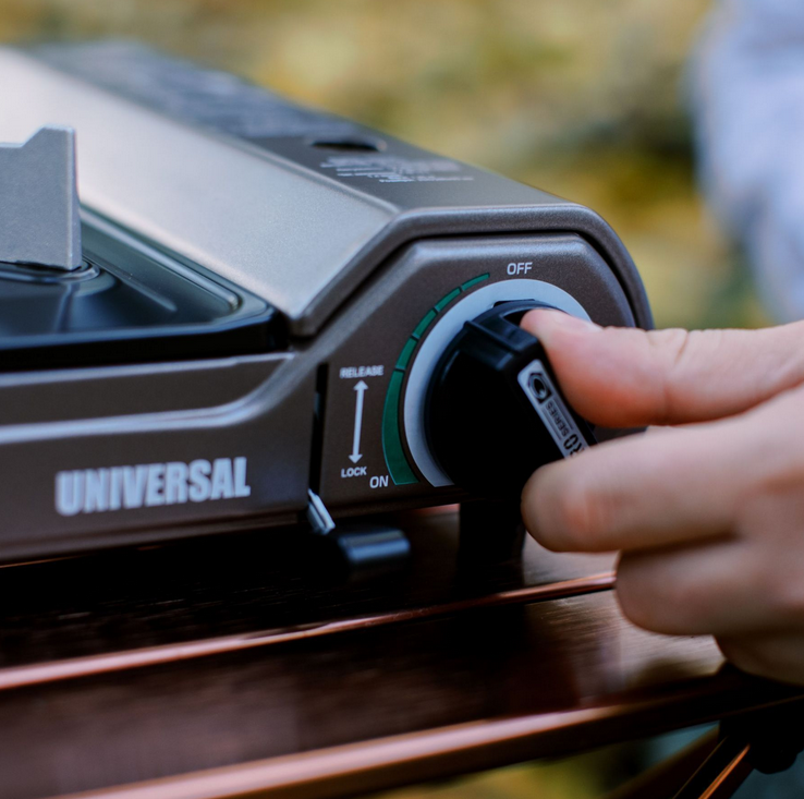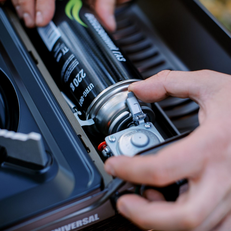 Туристическая кемпинговая газовая плита Tribe Universal, рассчитанная на использование как с портативным газовым цанговым картриджем, так и на работу с подключением большого, бытового, газового баллона (с обязательным использованием редуктора!) Переходник для подключения в комплекте, вы найдете его в зажиме внутри корпуса плиты.