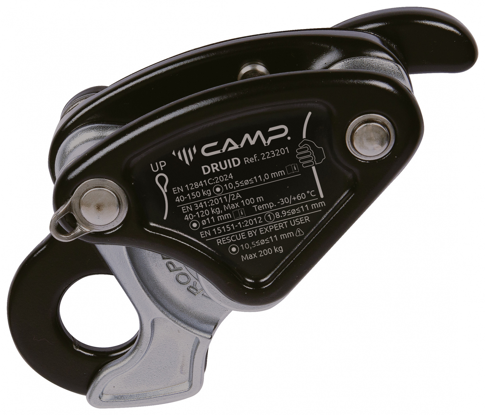 Druid от CAMP — это лёгкое, компактное спусковое устройство-автоблокант для веревочного доступа, спасательных работ и промышленного альпинизма, специально разработанное для полустатических верёвок диаметром 10–11 мм.