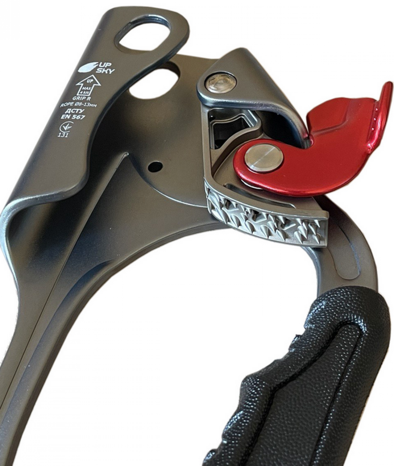 Правосторонняя эргономичная рукоятка с износостойким пластиковым покрытием обеспечивает комфортный и надёжный хват. Литой стальной зубчатый кулачок с отверстиями для отвода грязи снижает трение и гарантирует чёткую фиксацию на верёвке.